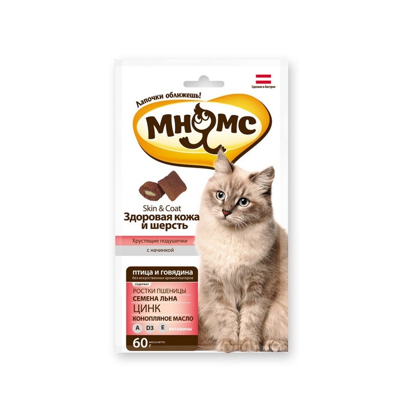 Лакомства мнямс хрустящие подушечки для кошек с птицей и говядиной "Здоровая кожа и шерсть" (60г)