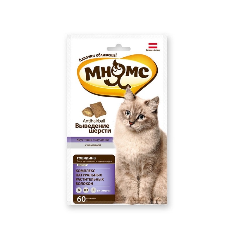 Мнямс хрустящие подушечки для кошек с говядиной Выведение шерсти 60 г.