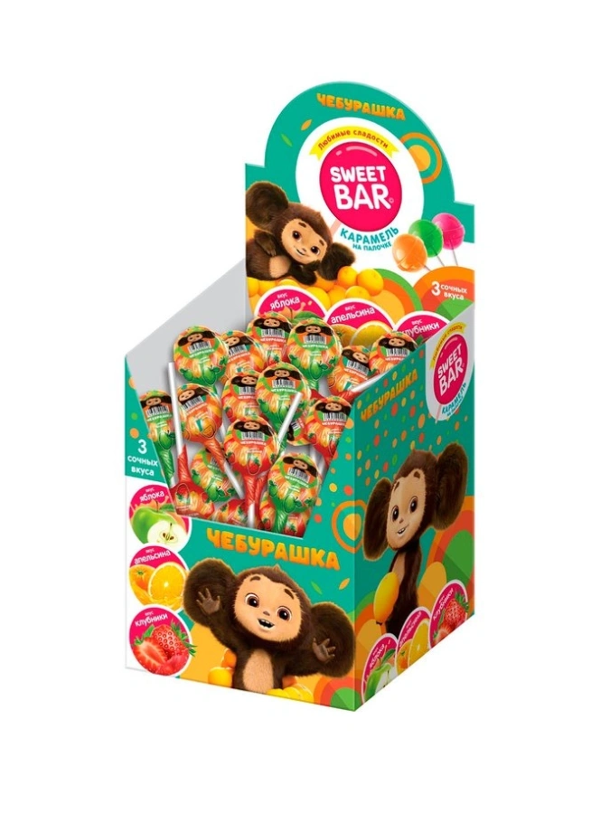 Карамель на палочке со вкусами апельсина, клубники, яблока "SWEET BAR" (ЧЕБУРАШКА) 11г